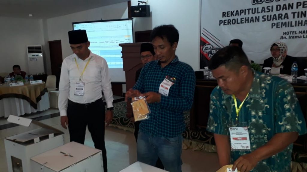 Anggota Bawaslu Kabupaten Kayong Utara Kosasih (Kiri) bersama Ketua KPU Kabupaten Kayong Utara Rudi Handoko dan PPK Kecamatan Kepulauan Karimata membuka Kotak Suara PPK yang akan diPlenokan.\n\n\n\nSukadana - Komisi Pemilihan Umum (KPU) Kabupaten Kayong Utara menggelar Rapat Pleno Terbuka Rekapitulasi dan Penetapan hasil Penghitungan Perolehan Suara tingkat Kabupaten Kayong Utara Pada Pemilu Tahun 2019 di Hotel Mahkota Kayong Jalan Irama Laut Sukadana Kabupaten Kayong Utara. Rabu (01.05.2019)